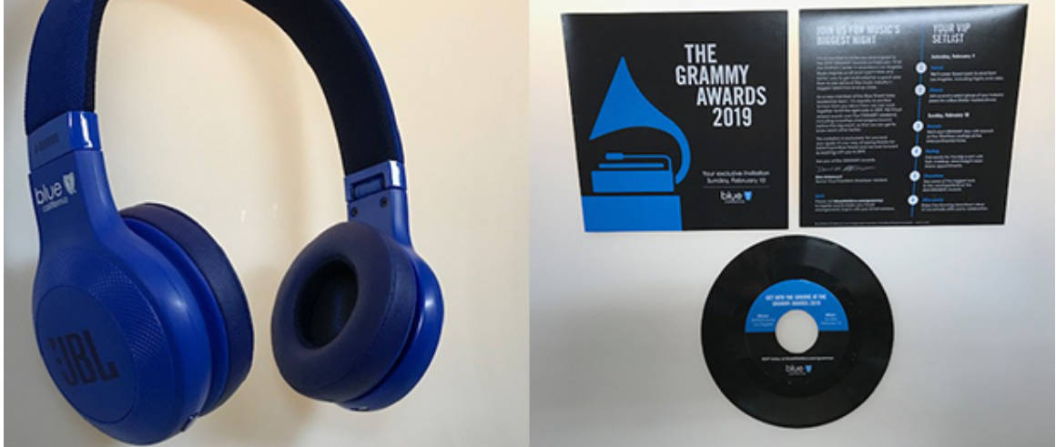除了唱片之外,LMS 还把另外两件物品放在了一起作为项目的一部分:格莱美颁奖典礼期间使用的品牌歌剧眼镜,以及 JBL 品牌耳机作为房间礼物,等待客人从活动回来,依偎在黑色礼物中带有品牌纸巾的盒子。