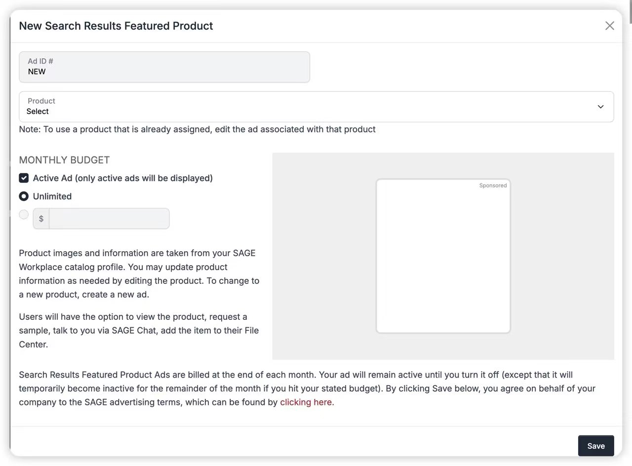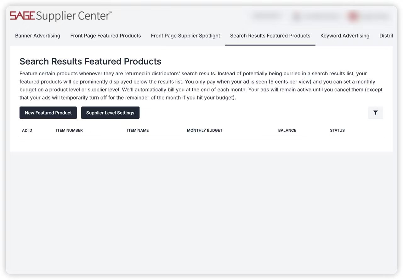 说明:在分销商对您的产品类别感兴趣时,将您的信息直接传递给他们!关键词广告让您能够通过便捷有效的产品关键词精准定位分销商!当分销商在 SAGE Workplace 中使用您的关键词搜索产品时,您的广告就会出现在搜索结果旁边。