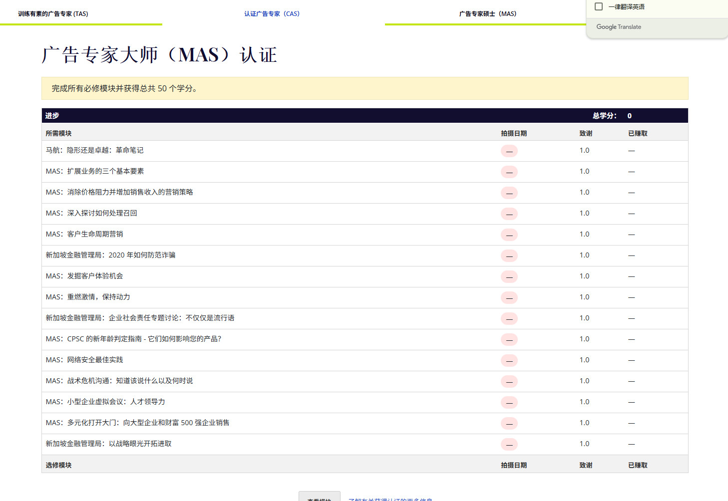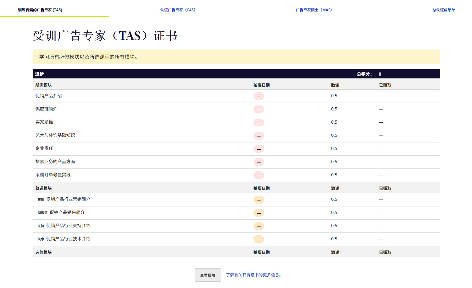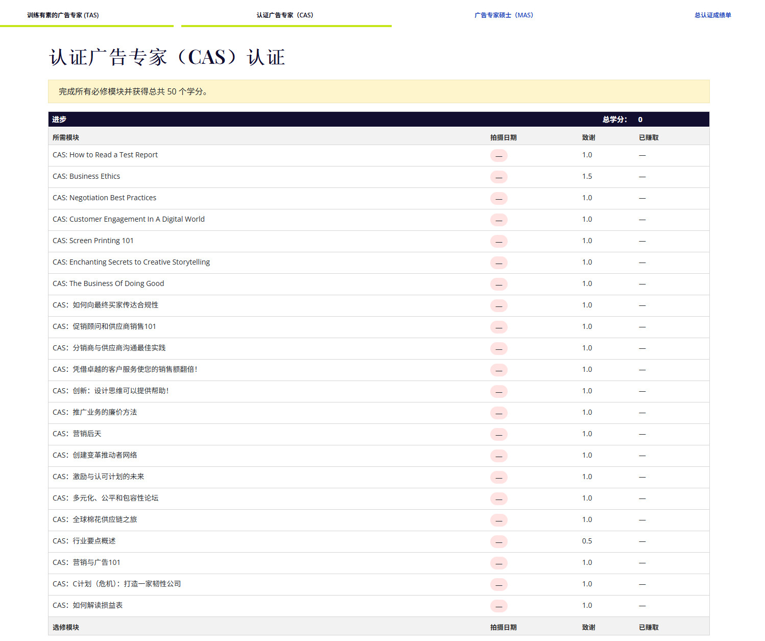 PPAI类似一个大学,认证广告专家 (CAS) 套餐认证广告专家 (CAS) 计划要求完成下面列出的所有 CAS 专用课程。此外,请从右侧栏中选择 25 个 CAS 级选修学分来完成 CAS 的选修部分。注册后,您将在仪表板(我的学习>注册的内容)中找到课程。一旦所有课程作业完成,您的仪表板中