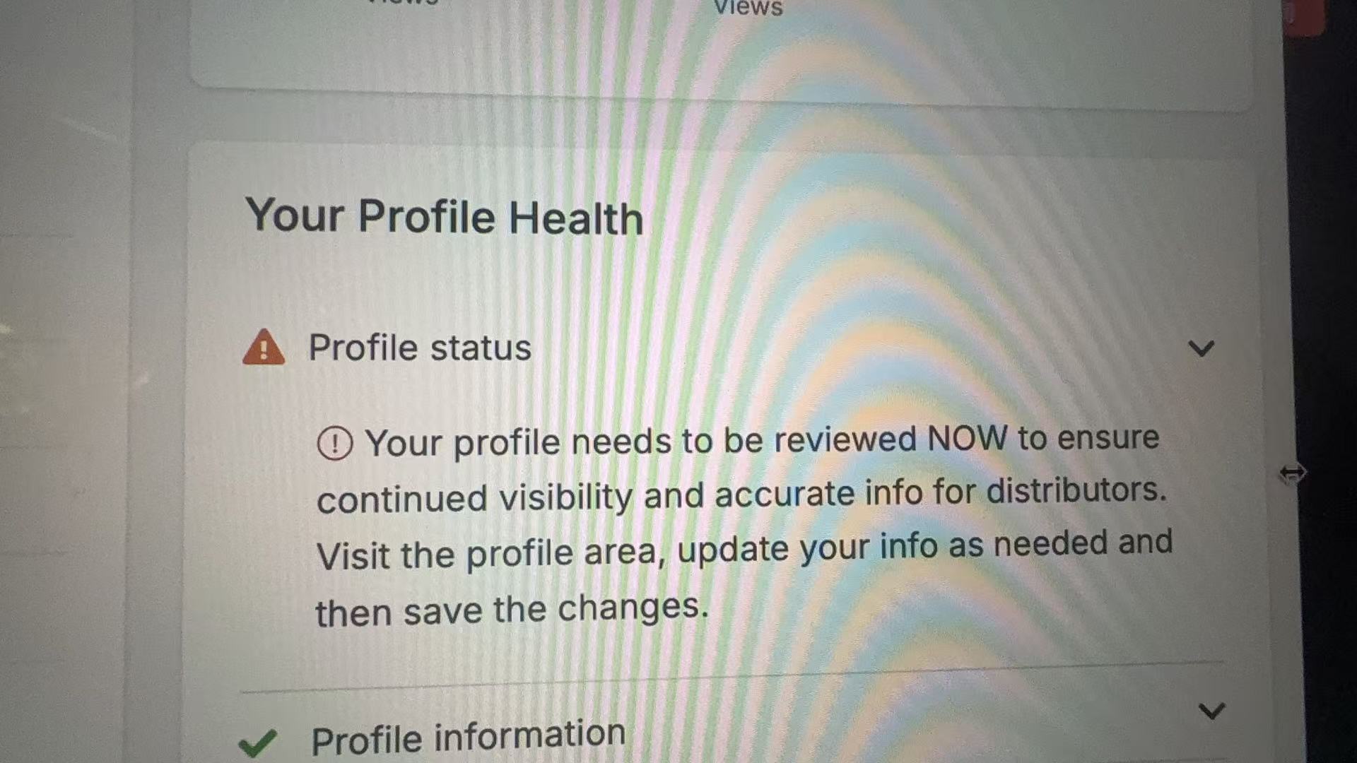 Your profile needs to be reviewed Now to ensure continued visibility and accurate info for distributors.Visit the profile area, update your info as needed andthen save the changes.Profile information