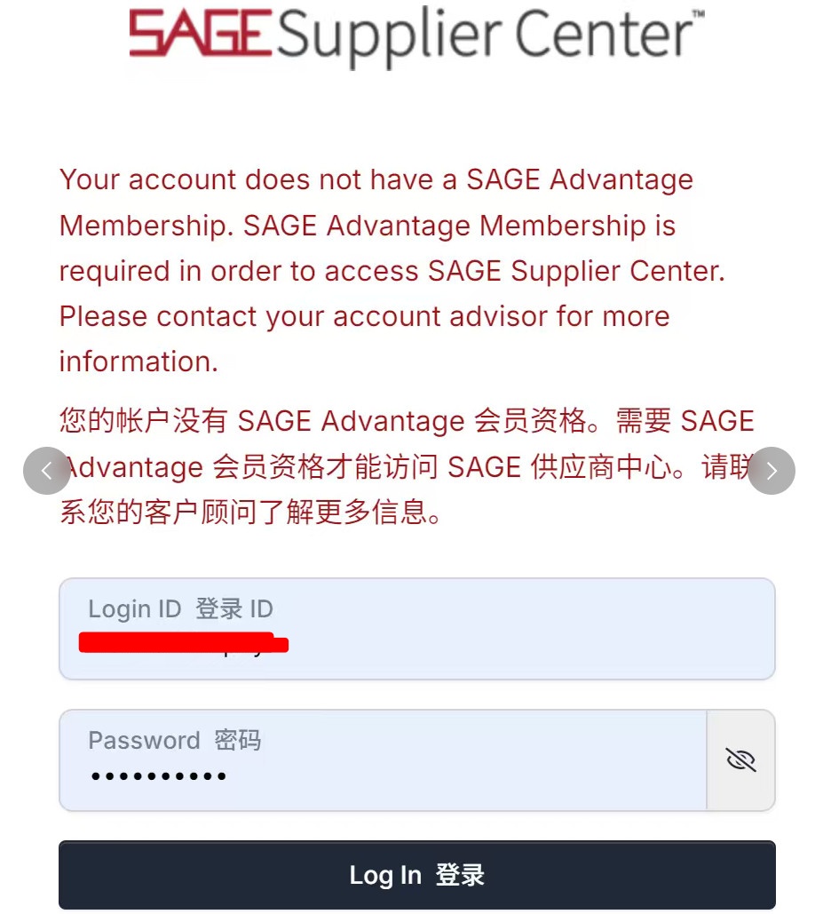 您的帐户没有SAGE Advantage会员资格。需要SAGEAdvantage会员资格才能访问SAGE供应商中心。请联系您的客户顾问了解更多信息。Login ID登录ID