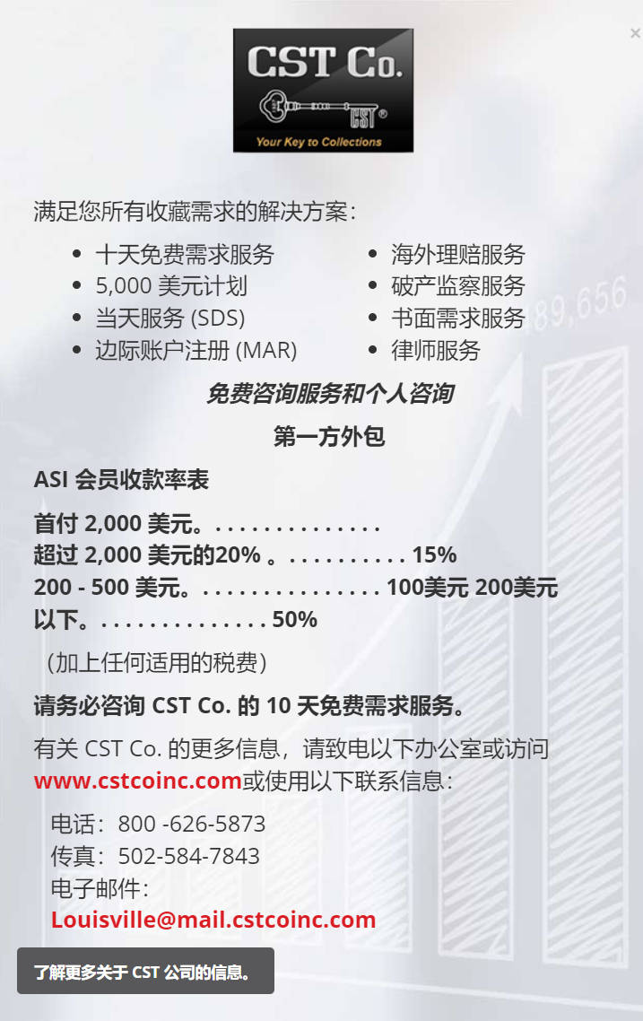 ASI官方就有合作的催收公司,提供您免费咨询服务和个人咨询第一方外包CST